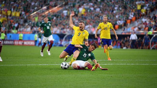 贝拉禁区边缘射偏 墨西哥首次机会出现在第17分钟,埃尔南德斯和洛萨诺连续传球,但贝拉禁区边缘的弧线球射门擦左侧立柱偏出。瑞典1分钟后还以颜色,卢斯蒂格右路传中,无人防守的福斯贝里10码处第一时间推射高出。拉尔森凌空蹬踏洛萨诺被黄牌警告。