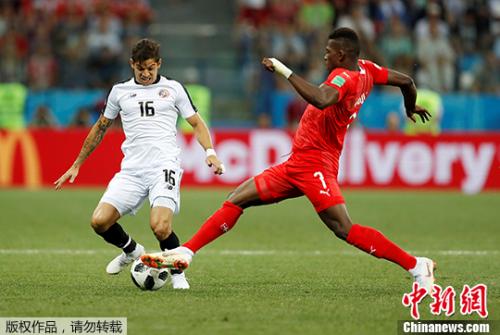 双方对抗激烈。 如果瑞士队在于哥斯达黎加的比赛中取胜,则将锁定一个出线名额。不过哥斯达黎加在开场后显得非常活跃,连续在瑞士瑞门前制造了几次杀机,可惜未能善加把握,而瑞士队沙奇里的横传禁区内打在哥斯达黎加队员手臂上,但主裁判没有任何表示。随后坎贝尔远射被门将扑出后,哥斯达黎加再传中博尔赫斯头球攻门,瑞士门将索默扑了一下后击中门柱弹出。 第10分钟科林德雷斯突入禁区射门再次击中横梁弹出,第20分钟同样的位置奥维多大力施射再被扑出。在顶过对手开局猛攻后,瑞士队在第31分钟率先破门,是时恩博洛接利希施泰纳传中头球一蹭,哲马伊利包抄到位破门得分。这个进球显示瑞士队经验老道,在哥斯达黎加策动反击时积极前场反抢,打了对手一个措手不及。上半场比赛结束,瑞士队1:0领先。 瑞士队在传控方面优于对手,无论是控球率、传球成功率等数据都超出哥斯达黎加。第55分钟,哥斯达黎加将比分扳平,是时他们获得角球机会,沃森接坎贝尔传球头球破门。随后的比赛双方互有攻防,但都没能再获得进球,直到比赛尾声又重新上演了高潮的一幕。