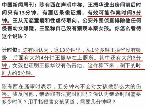 本来,水母对于上市公司董事长王振华猥亵9岁女童一案,并无太多关注。 前几天法院一审给王振华判了个5年,水母也只是简单扫了一眼标题,压根连新闻的正文都没点进去看。 但是就在昨天,一条新闻让水母直接把可乐喷在了手机屏幕上: 本来陈有西不说这番话,大伙儿还不知道王振华有“喜欢找年轻漂亮女性嫖宿”的兴趣爱好。 而且“底线”居然这么“高”! 要不是对陈有西大律师久仰多年,单看这条新闻水母差点以为陈有西不是王振华的辩护律师,而是负责向王振华提起诉讼的检察官。。。 说起来很多新朋友可能不知道,水母和陈有西大律师,那是非常有“缘分”的。 4年前,水母创立公众号“水母真探社”的初衷,恰恰和当时陈有西大律师代理的案件有关:2016年,北京“雷某”嫖娼案。 话说当年,陈有西大律师被嫖客雷的家属聘为代理人,磨拳霍霍,准备好好施展一番拳脚。 全国汹涌的舆情恨不得把警察撕碎了吃掉。 水母果断的注册了公众号“水母真探社”,孤军奋战,为人民警察辩论得口干舌燥。 结果这个案子,没有等到开庭,检察院直接撤诉了。 那些高喊让警察坐牢甚至枪毙的人,最终没有得逞。 由于这个案子比较敏感,并且时过境迁,水母就不再展开多说了。 时间从嫖客雷案再往前推3年,就是2013年著名的李天一轮奸案。 当时,认为李天一这个强奸犯是被冤枉的,也是咱们的陈有西大律师。 最后的结果:当时只有17岁的未成年人李天一,被法院按照刑法中规定的未成年人实施强奸的顶格刑期标准,判处了有期徒刑十年。 也就是说,在陈有西大律师的关心呵护之下,李天一没有获得哪怕1天的轻判,直到现在都还没有出来。 好了,说了半天,不知道大家总结出与陈有西大律师有关的这几起案件的特点了没有? 李天一:强奸犯、轮奸犯。 雷某:嫖客。 王振华:猥亵男、超级大变态、喜欢嫖宿16岁以上女性,而且非常有“底线”。 在陈有西大律师的精心呵护下,李天一被顶格判刑、雷某的案子检察院直接撤诉、王振华的形象在陈有西大律师接受媒体“独家专访”后又再次刷新了下线,已经引发全国老百姓的滔天怒火,接下来的二审形势岌岌可危。 陈有西大律师,不愧是“淫棍克星”、“嫖客杀手”,在此,水母先向您90度三鞠躬,以示敬意。 哦对了,还有一个细节要和大家阐述一下。 陈有西大律师代理这种强奸、嫖娼的案子的时候,喜欢和法官辩论“时间”问题。 以这次王振华案为例,多家媒体报道,陈有西在法庭上辩论称:王振华作案时间只有5分钟,而5分钟的时间不会对一个女孩造成“阴道撕裂”这样大的伤害。 类似的观点在当年雷某嫖娼案的时候,也被一群二B讨论过,说什么“5分钟”怎么可能完成一次性行为?怎么可能实施一次嫖娼? 真TM荒唐,5分钟无法实施一次性行为的话,你觉得满大街到处开的成人用品店里是卖什么的? 大标语的“让你坚持久一点”的东西是做什么用的? 回到陈有西辩护的王振华案来说,陈有西认为“5分钟无法对一个女孩造成阴道撕裂的伤害”,为此水母专门从网上找了一段拳击比赛的画面,希望陈有西大律师拿着秒表好好算一下,一个职业男子拳击手打趴下另外一个职业男子拳击手,需要多长的时间:
