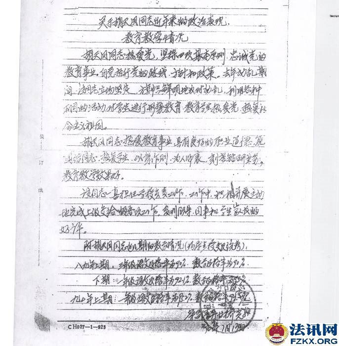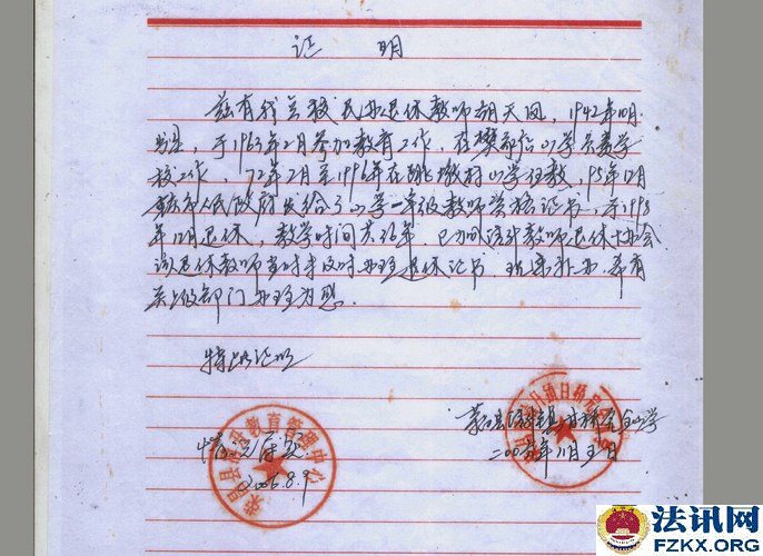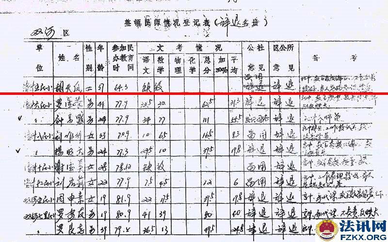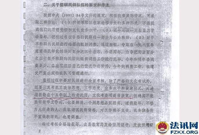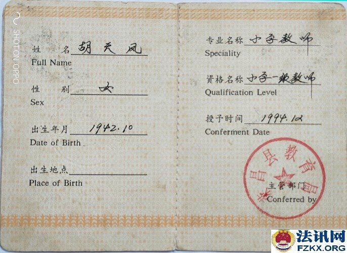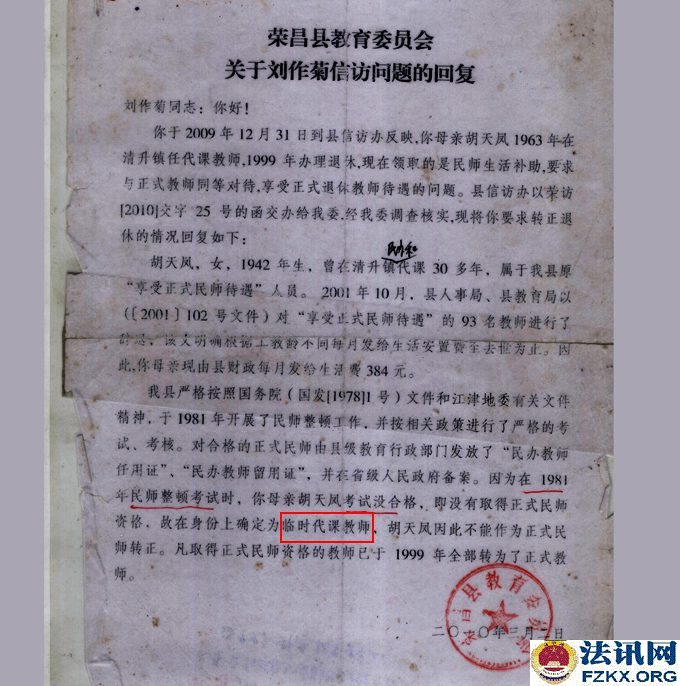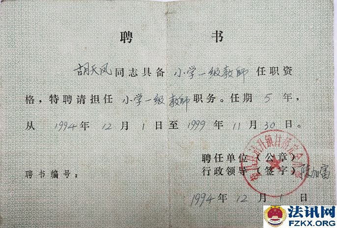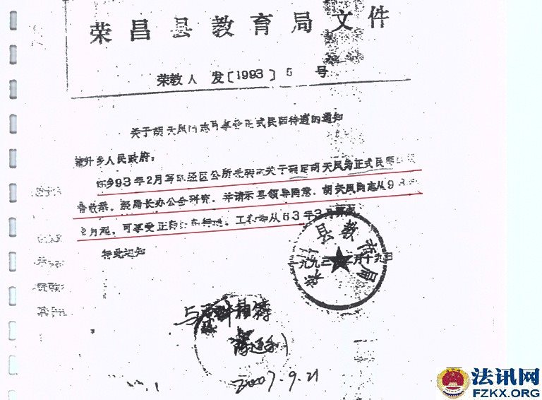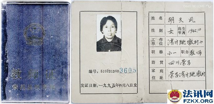 重庆荣昌小学一级教师胡天凤36年工龄 待遇不如五保老人 1963年,国家提倡创办民办学校,樊家店小学也就是在同年2月开始创办,胡天凤被樊家店村支部书记钟治高和樊家店小学负责人黎光琼推荐到该校,负责教育工作,从一至五年级语文、数学、思想品德、体育等课程包干。用胡天凤的话说,她是第一次也是第一个被推荐。然而,从未违纪违规的她,连续任教36年,一直又是学校负责人,却被悄悄辞退,至今每月工资只有384元,还不如一个五保老人(每人每月生活补助754元)。 事情得从1981年说起。 1981年全国民办教师整顿。《川府发【1981】129号》文件,要求对民师进行全面考核,除严格的文化考试外,还要认真考察其政治思想、工作态度、业务水平和健康状况,对连续教龄在15年以上的老民师,文化考察可适当放宽,但确实不能胜任教学工作的,也要辞退。 对个别思想品质恶劣、道德败坏,不堪为人师表的人,应取消民师资格。 对工作极为不负责,或者身体条件不宜做教师的,也要调整。经过考核合格的教师,由县教育局发给任用证书,发放任用证书应从严控制。 对过去发放面广、未保证质量的,要按上述要求,重新进行考核,另发任用证书。 对调整出去的民师应做好思想工作,学校要热情欢送,社队要热情欢迎,由生产队妥善安排,有条件的也可安排到社队企事业单位。对于被辞退的民师,可酌情发给一次性的少量补助费,具体办法由教育厅另文下达,今后一律不再补充正式民师。 如调整后教师有缺额时,可聘请代课教师。  ▲图为:川府发【1981】129号文件;查阅时间:2018.08.24 胡天凤还未进入考场,突然生病,不能坚持答卷,可查阅试卷注释。清升公社民办教师管理小组在辞退名册上认定的是“缺级”,意见是“留用”,双河区公所意见是“辞退”,备注胡天凤是初中文化,教学态度端正,质量效果较好,本人基础知识较差。 此时,荣昌县教育局并未让胡天凤知晓辞退的事情,而是继续任教。  ▲图为:辞退名册;2013.11.07荣昌县教育局在法庭上提供 《川教人【1987】6号》文件规定,当年未确认其民师资格,也未发给准聘证书,但因多年从事民师工作,当地教育工作又需要,被留用为民办教师并享受民办教师待遇,在最近几年的教材教法考试中达到合格的,可以确认其民办教师资格,发给准聘证书。对留用民师教材教法考试不及格者,可以再给一次考试机会,达到合格的予以确认,仍不合格者要坚决予以辞退。辞退民办教师后的缺额,一律不再补充正式民办教师,违者,要追究有关领导的责任。 胡天凤既然已经被“辞退”,还让其继续任教36年,根据《川教人【1987】6号》文件规定,当时的有关领导并未被责任追究。  ▲图为:川教人【1987】6号文件;查阅时间:2019.05.16 1990年荣昌县清升镇甘桥完全小学作出《关于胡天凤同志近年来的政治表现、教育教学情况》,称胡天凤同志热爱党,坚持四项基本原则,忠诚党的教育事业,自觉执行党的路线,旗帜鲜明地反对动乱,利用各种不同的活动,对学生进行形势教育,教育学生热爱党,热爱社会主义祖国。还称胡天凤热爱教育事业,具有良好的职业道德,能团结同志,热爱学生,以身作则,为人师表,刻苦钻研业务,教育教学效果好。该同志一直担任学校负责工作,受到领导、同事和学生家长的好评。点校交叉统考情况:1989年上期,三年级语文及格率为90%,数学及格率为90%;下期,一年级语文及格率92.1%,数学及格率为95%;1990年上期,一年级语文及格率为95.2%,数学及格率为93.5%。 有了清升镇甘桥完全小学作出的《关于胡天凤同志近年来的政治表现、教育教学情况》,已经符合川教人【1987】6号文件精神,就应发放《任用证书》。  ▲图为:政治表现、教育教学情况;清升镇甘桥完全小学提供 荣昌县教育局《荣教人发【1993】5号》文件关于胡天凤同志可享受正式民师待遇的通知,工教龄从1963年3月算起。1994年9月胡天凤被清升镇党委、清升镇政府评为先进教师;1994年12月4日,清升镇甘桥完全小学聘胡天凤为一级教师;1994年12月,重庆市人民政府授予胡天凤为小学一级教师,并颁发专业技术资格证书;1995年12月8日,荣昌县教育局为胡天凤颁发了小学一级教师证。  ▲图为:荣教人发【1993】5号文件,查阅时间:2007.09.21  ▲图为:清升镇党委、镇政府颁发的先进教师奖状   ▲图为:专业技术职务聘书    ▲图为:重庆市人民政府授予的小学一级教师专业技术资格证书