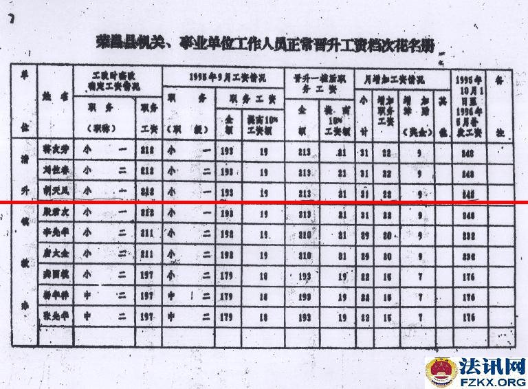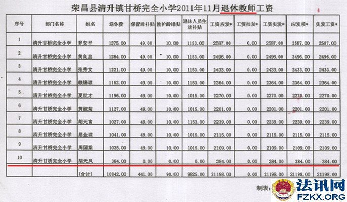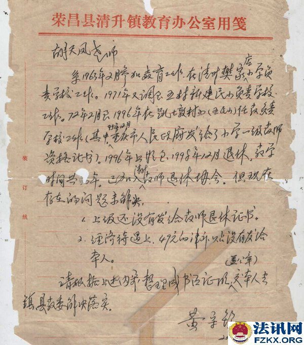 ▲图为:荣昌县教育局颁发的教师证 人事部 财政部 国家计划委员会《人薪发【1995】150号》(机关、事业单位工作人员正常晋升工资档次办法)、四川省人事厅 财政厅 计划委员会《川人工【1996】4号》文件,规定机关、事业单位正式工作人员中,凡1993年10月1日工资制度改革后,两年考核成绩均为称职(合格)以上的人员,可从1995年10月1日起在本职务(技术等级)所对应的工资标准内晋升一个工资档次。考核不称职(不合格),以及两年中只有一年考核称职(合格)的人员,不得晋升工资档次。胡天凤已享受其待遇。   ▲图为:荣人薪发【1996】720号文件,胡天凤已享受在册中小学教师提高10%的工资 1999年,57岁的胡天凤老师,站在三尺讲台,连续任教36年,已超过法定退休年龄。同年12月,胡天凤根据家里实际情况,遂向学校申请退休,学校还组织了欢送。 2006年,全县落实从1994年至2006年津补贴政策,在职教师每人每月69元,退休教师每人每月49元,胡天凤因未得到该补贴,才开始了解情况,先后得到的回复是“你是临时代课教师,已被2001年的102号文件辞退”。 胡天凤持有清升镇甘桥完全小学发放的小学一级教师聘书、重庆市人民政府发放的小学一级教师专业技术资格证书、荣昌县教育局发放的小学一级教师证,历年来工资表上显示的是“退休教师”,2008年清升镇回龙完全小学也为“单位职工胡天凤”购买了“城镇职工医疗保险”(卡号:A78152410)。然而,在2010年荣昌县教育局信访回复,胡天凤的身份又是“临时代课教师”,荣昌县教育局并未将荣昌县教育局、荣昌县人事局作出的《荣教人发【2001】102号》(关于辞退和妥善安置“享受正式民师待遇”教师的通知)送达胡天凤知晓,是2014年庭审中才知道增加了50元钱后作为被“辞退”的依据。事实上,该文件明确的是:“凡教龄男满30年,女满25年的,享受正式民师待遇的教师,1998年以来未调整工资的,在现行月工资标准的基础上,可增加50元后,再按两项之和的100%计发月安置费”,《荣人薪发【1996】720号》文件已对身份进行了确认,就不应对胡天凤增加50元。其增加了50元,就是以发放安置费代替退休。  ▲图为:2006年8月3日,清升镇甘桥完全小学校校长的证明