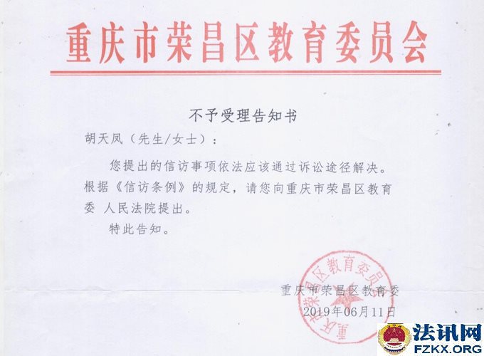 ▲图为:二审行政裁定 2019年5月22日,重庆市信访办公室回复,让胡天凤向荣昌区政府提出。荣昌区政府又责成区教委处理,区教委又作出不予受理的书面告知。称提出的信访事项依法应该通过诉讼途径解决,请向重庆市荣昌区教育委 人民法院提出。荒唐的是,荣昌区教委已经作出不予受理的书面告知,还让胡天凤向荣昌区教委提出!