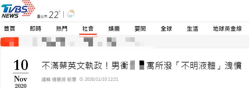 | 原标题:“担心解放军真打来”,男子把“不明液体”泼向蔡英文家! 因不满蔡英文执政,台湾一男子向蔡英文寓所泼洒“不明液体”泄愤 据台湾TVBS新闻网11月10日报道,台湾一名52岁男子9日上午在台当局领导人蔡英文所居住的永和寓所外泼洒不明液体,随即逃离现场,台湾警方接到报案后立即追缉嫌犯,今日(10日)凌晨将其逮捕归案,男子称是因不满蔡英文执政,担心解放军真的打来台湾,才会以此方式泄愤。 台媒报道截图报道称,永和寓所社区主委发现大楼外被泼洒不明液体后报案,由于该处为蔡英文寓所,警方立即调阅监控器追查,发现52岁的马姓男子10月就曾出现在该社区外,疑似是事先勘查地形,又在其个人脸书中,发现有反民进党当局的言论,因此循线找到马姓男子位于永和区文化路的住所。 男子在蔡英文寓所外泼洒液体。(图片来源:台媒)10日凌晨,台湾警方将马姓男子带走调查。该男子供称,系因不满蔡英文执政不利,两岸关系紧张,担心解放军“攻打”台湾,才会采取此举泄愤。 台湾“三立新闻网”称,初步了解,该男子所泼洒的液体疑似为水或咖啡等。由于该男子精神状况不稳定,警方预计先行将他强制就医,后续再依恐吓危害安全罪侦办。 另据中时新闻网报道,针对这起事件,蔡英文办公室发言人张惇涵10日称,已在第一时间通过警方掌握状况。目前该名男子已由警方拘捕,后续并交由警方侦办。 来源:环球网/小尹 |