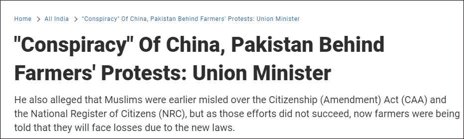 | 原标题:农民示威15天不散,印度政客张口就来:都是中巴搞的鬼 [文/观察者网 齐倩]印度农民示威已经进入第十五天,局势未见任何平息迹象。在废除新农业法案的要求被官方回绝后,多个农民团体呼吁,12月14日将在全国范围内举行更大规模抗议活动。 值此之际,为了转移国内矛盾,印度政客开始强行把锅甩给中国和巴基斯坦。 据印度NDTV电视台报道,当地时间12月9日,印度消费者事务、食品和公共分配部部长丹维(Raosaheb Danve)公然声称,中国和巴基斯坦是该国农民抗议的“幕后发起者”,这是“其他国家的阴谋”。 但报道直言,丹维没有提供任何证据加以佐证。对此,印度反对党发言人痛斥,以丹维为代表的人民党领导层把中巴硬扯进来,表明他们“已经失去理智”。 ![]() 报道截图近期,印度联邦院(上院) 相继通过了《2020基本商品(修正)法案》、《2020农产品贸易和商业(促进和便利)法案》和《2020农民(授权和保护)价格保证协议和农业服务法案》。 在此之前,印度一直实施“最低保证价格”(MSP)政策,以“保证价格”购买粮食,确保批发农产品售价维持在一定水平。但最新三项法案意味着,印度政府不再以保证价格从印度农民手中收购粮食。 此举引发印度农民的担忧,他们质疑此举将导致粮食巨头操纵粮食市场,许多人可能会失去土地。自11月26日起,印度全国各地的农民纷纷涌进首都新德里,以示抗议。 如今,印度农民示威已经进入第十五天。自抗议开始以来,至少有五人因为警民冲突死亡。 综合印度NDTV电视台等媒体报道,印度政府近日做出表态:不会撤回法案,只会对法案内容进行修正。当地时间12月9日,多个农民团体拒绝政府这一提议,宣布了一系列升级抗议活动的计划——12月14日,占领首都地区的多个高速公路和购物中心。 ![]() 在示威活动中,有示威者挥舞印度共产党农民阵线(AIKS),图自印媒眼见局势即将升级,印度政客坐不住了,开始强行甩锅。 在当天举行的一场健康中心落成典礼上,印度消费者事务、食品和公共分配部部长丹维竟公然声称印度现下的“风波”不属于“农民抗议”,并在没有任何证据的前提下给邻国“泼脏水”。 他宣称:“正在进行的风波不是农民示威,中国和巴基斯坦在背后推波助澜了。最一开始,他们煽动我们国家的穆斯林,但没有成功。现在开始鼓动农民了。”他还坚称莫迪是“农民总理”,做出的任何决定“都不会不利于农民”。 在讲话中,丹维甚至污蔑道,在印度颁布《公民身份(修正案)法》(CAA)和《国家公民登记册》(NRC)两项法案时,中巴两国曾试图误导该国穆斯林。 但NDTV在报道中直言,丹维没有提供任何证据加以佐证,也没有对自己的表态进行详细说明。对于丹维如此不负责任的发言,印度国内出现了一些批评声音。 印度消费者事务、食品和公共分配部部长丹维,图自印媒另据印度《经济时报》9日报道,印度右翼政党“湿婆神军党”(Shiv Sena)发言人表示,因为在马哈拉施特拉邦失去权力,以丹维为代表的人民党领导层“已经失去理智”,现在开始把中国和巴基斯坦牵扯进来。“他们根本就不知道,自己到底在说些啥。” 印度农民组织Swabhimani Shetkari Sanghatana 领导人谢蒂(Raju Shetti)则对丹维猛烈抨击,称印度政府就是在玩火。他提醒道:“在80年代,旁遮普邦的内部冲突也是由于农作物价格低廉。 我认为政府中的某些人希望解决这个问题。” 值得一提的是,就在丹维给中巴“泼脏水”的同一天(9日),欧洲公益组织“EU DisinfoLab”发布报告称,过去15年来,一个总部位于新德里的集团假借联合国人权理事会名义,在世界范围内发布了750多条抹黑中国和巴基斯坦的虚假新闻。 据美国“政客”新闻网欧洲版(Politico EU)报道称,该集团的主要目的是为了降低中国和巴基斯坦的国际声誉,并对联合国人权理事会和欧洲议会的决定造成影响。 现在尚无证据显示该集团与印度政府有关,但其内容的生产和更新主要由印度国内最大的电视通讯社——亚洲国际新闻(ANI)负责,并曾邀请右翼欧洲议会成员赴印与莫迪见面。 |