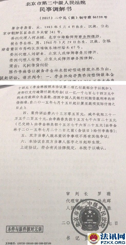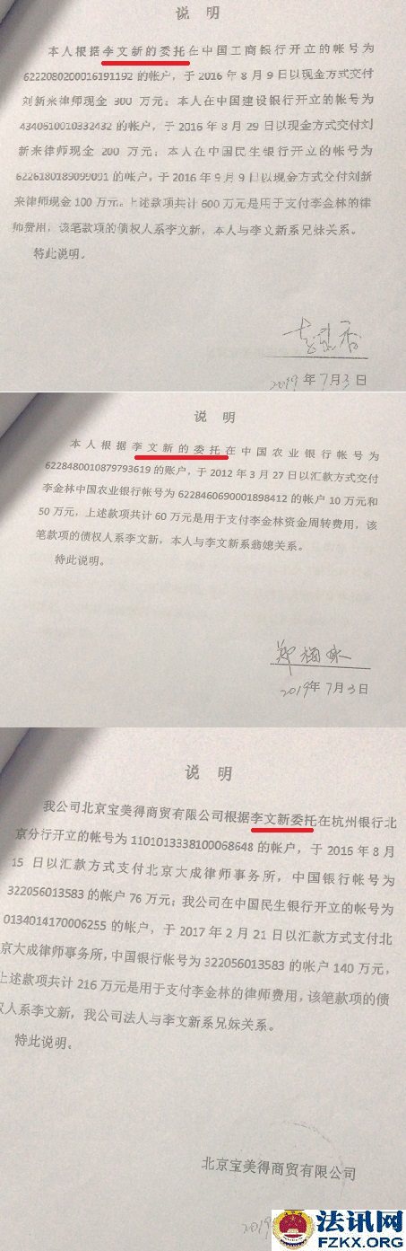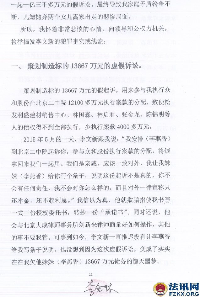 法讯君从多位莆田商人中获悉,因涉嫌虚假诉讼,莆田人李燕香、李金林被北京市公安局丰台分局刑事拘留。 李金林是莆田人,在其堂弟李文新控制的北京闽商担保投资有限公司、北京豪威特供热设备有限公司等公司打工,干了近30年。莆田黄璋宝特大集资案被列入2016年十大非法集资大案,涉案金额49亿余元,涉及200余家企业,受害者多为福建莆田人,数目超过1000人,该案致6人死亡。内心受到煎熬而良心发现的李金林于2019年12月12日,愤而向北京市政法机关领导检举揭发李文新重大犯罪行为和线索,其中第一条就是策划制造标的13667万元的虚假诉讼。该案件用来参与李金林执行众和股份在北京二中院12100多万元执行案款的分配,致使五名莆商的债权得不到全部执行,少执行案款4000多万元。 李燕香是李文新的妹妹,在李文新多家公司里负责财务。 北京市中级人民法院(2015)二中民(商)初字第06520号民事调解书显示,李燕香与李金林共同确认:截至二0一五年七月十五日,李金林尚欠李燕香借款本金一亿一千七百七十四万元、利息三千四百八十二万九千四百五十四元,共计一亿三千二百五十六万九千四百五十四元。 笔迹鉴定这里的李金林签字非李金林书写 检举信里,李金林述说了虚假诉讼的情况。 2015年5月的一天,李文新跟我说:“我安排(李燕香)到北京二中院起诉你,参与众和股份执行案款的分配,将钱 拿回来我们一起用。我们是亲戚,应该一致对外,我让我妹妹(李燕香)给你写个条子,说明这份起诉不是真的,你不会有任何责任,我不会对你怎么样的,而且对外-律宣称只还本金,还不起利息。”我信以为真,他就欺骗指使我书写一式三份授权委托书,转抄-份“承诺书”。同时还说,他会与北京大成律师事务所刘某某律师商量好如何操作,其他的事不要我管。可事到如今,李文新一直推迟没有让李燕香给我写条子说明。也没想到因为这次虚假诉讼,变成了实实在在我欠他妹妹(李燕香)13667万元债务的惊天噩梦。 2016年6月,李燕香拿到执行案款7655万元后,北京大成律所刘某某律师与李文新商议,让我配合刘某某律师,设法让松发利盛建材销售中心、林国森、林启君、张金龙、陈锦明等债权人达到只还本金还不起利息的结果,即执行不到4000多万元的利息案款,李文新答应给予刘某某律师30%的回报,即李文新应给1200万元,前期先支付给刘新来800万元。于是,李文新指令李燕香先提取600万元现金给刘某某律师,又由李燕香从其账户转到大成律师事务所140万元(大成所开具发票),再从李文新儿媳郑梅妹处已经结算给我的2012年业务提成60万元,也一同拿来凑数。 为了使该虚假诉讼更真实,李文新将上述共计800万元给刘某某的好处费,加上松发利盛建材销售中心、林国森、林启君、张金龙、陈锦明等人由李文新支付的应诉律师费用76万元,共计876万元,让我书写一个欠条。 从这以后,我天天向李文新要证明该起假诉讼的证明条子,他以北京二中院执行众和股份的案款还没有全部拿到手为由,一拖再拖,一直不给我写条子。 我质问李文新:“我已经按照你的吩咐做到位了,该写的写了,该抄的抄了,你的目的达到了,为什么你一拖再拖至今仍不给我写条子?你不该这样害我,这样的话,你的名声也不好!”他说:“你以前不是说要自杀吗?到现在不是还没有自杀吗?”他还扬言,我钱没有他多,社会关系没有他硬...... 该起虚假诉讼的被告律师费用由原告支付,这是开具的800万元部分发票。据了解,该诉讼的李金林的800多万元律师费其实是由李文新给付的。 李文新儿媳、妹妹及宝美得公司的说明,证明是受李文新委托。员工是给老板打工、老板指到那里员工打到那里,员工犯错被依法刑拘、那么得利的老板逍遥法外? 检举信发出后,今年1月15日,涉案人李燕香和李金林被北京市公安局丰台分局刑事拘留,目前案件还在进一步审理中。(李海波)