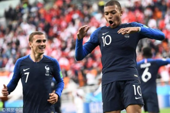 次战秘鲁姆巴佩初露峥嵘 【次战摇摇晃晃,只进一球】 作为平均年龄最小的法国队,应该说是体力最充沛的,但在世界杯前两场比赛中完全看不出来。尽管在面对印加军团秘鲁时,法国人以最“实惠”的方式拿下了胜利。但是无论从场上的活力,还是德尚的调整,都看不出这是一支志在争冠的队伍。 而且本来能够打出N种进攻套路的法国人在第二场小组赛所取得的进球和第一场比赛所取得的进球套路一模一样——博格巴断球后找吉鲁,吉鲁似传似射先被破坏掉,二点姆巴佩包抄得手。似乎除了高点找吉鲁,法国队就没办法进行更好的进攻了。 虽然说德尚在第一场比赛中开启“无锋阵”不管用之后,还是做了自我修正重新启用吉鲁,但法国队整体表现依然平平无奇,完全看不出是有着十多亿身价的球队,要知道法国的攻击线是有多么的豪华啊!