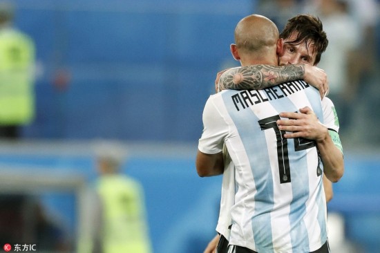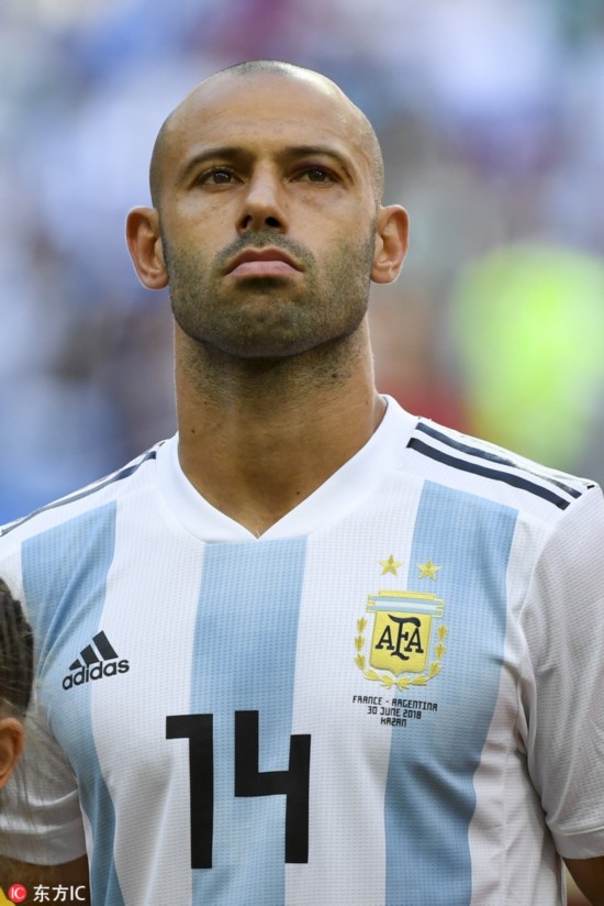 当地时间2018年6月30日,俄罗斯喀山,2018世界杯1/8决赛,法国4-3阿根廷。赛后,阿根廷球员马斯切拉诺宣布退出国家队。2006-2018,马斯切拉诺4次参加世界杯,出战20场;国家队层面,更是创纪录的为国征战147场。“是时候说再见了。从现在起,我是一名阿根廷球迷了。”,愿未来的日子,小马哥一切都好。图为阿根廷队在世界杯首场小组赛中2比1战胜科特迪瓦队,马斯切拉诺首发出场,完成了世界杯首秀。