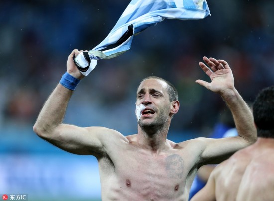 当地时间2014年7月9日,圣保罗科林蒂安体育场,2014巴西世界杯半决赛,荷兰0-0阿根廷。点球大战,荷兰队首先出场的弗拉尔和第3个出场的斯内德射门均被阿根廷门将斯内德扑出,阿根廷出场的4人将球全部打进,荷兰2-4不敌对手。马斯切拉诺血染赛场。