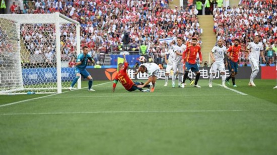 拉莫斯庆祝进球 北京时间7月1日22:00(莫斯科当地时间17:00),2018年世界杯1/8决赛第三场比赛在卢日尼基球场展开角逐,西班牙对阵俄罗斯。 俄罗斯此前6次对阵西班牙仅2平4负未尝胜绩,其中双方去年11月曾在圣彼得堡3比3战平。西班牙小组赛1胜2平夺头名出线,但此前4次在大赛中对阵东道主从未取胜,纳乔、科凯和阿森西奥轮换出场。俄罗斯在最后一场小组赛失望落败,库兹亚耶夫、戈洛文、日尔科夫和费尔南德斯轮换出场。 俄罗斯开场后压缩防守空间坚持稳守反击,西班牙则耐心控球寻找机会。西班牙第11分钟取得领先,日尔科夫对纳乔犯规,阿森西奥右路任意球传中,伊格纳舍维奇背对来球防守拉莫斯,皮球打在俄罗斯后卫腿上偏转入网。38岁352天的伊格纳舍维奇成为世界杯中打入乌龙球最年长球员。这也是俄罗斯第4次定位球失分。