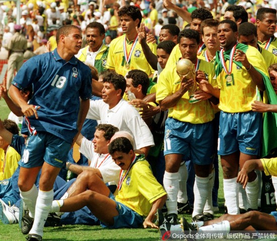 1994年美国世界杯决赛:巴西0:0(点球3:2)胜意大利 功臣巴乔罚失最后点球 巴西队队员庆祝夺冠,罗纳尔多与罗马里奥手举奖杯。